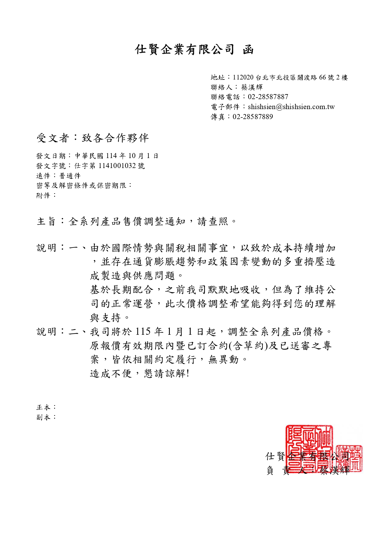 產品售價調整通知